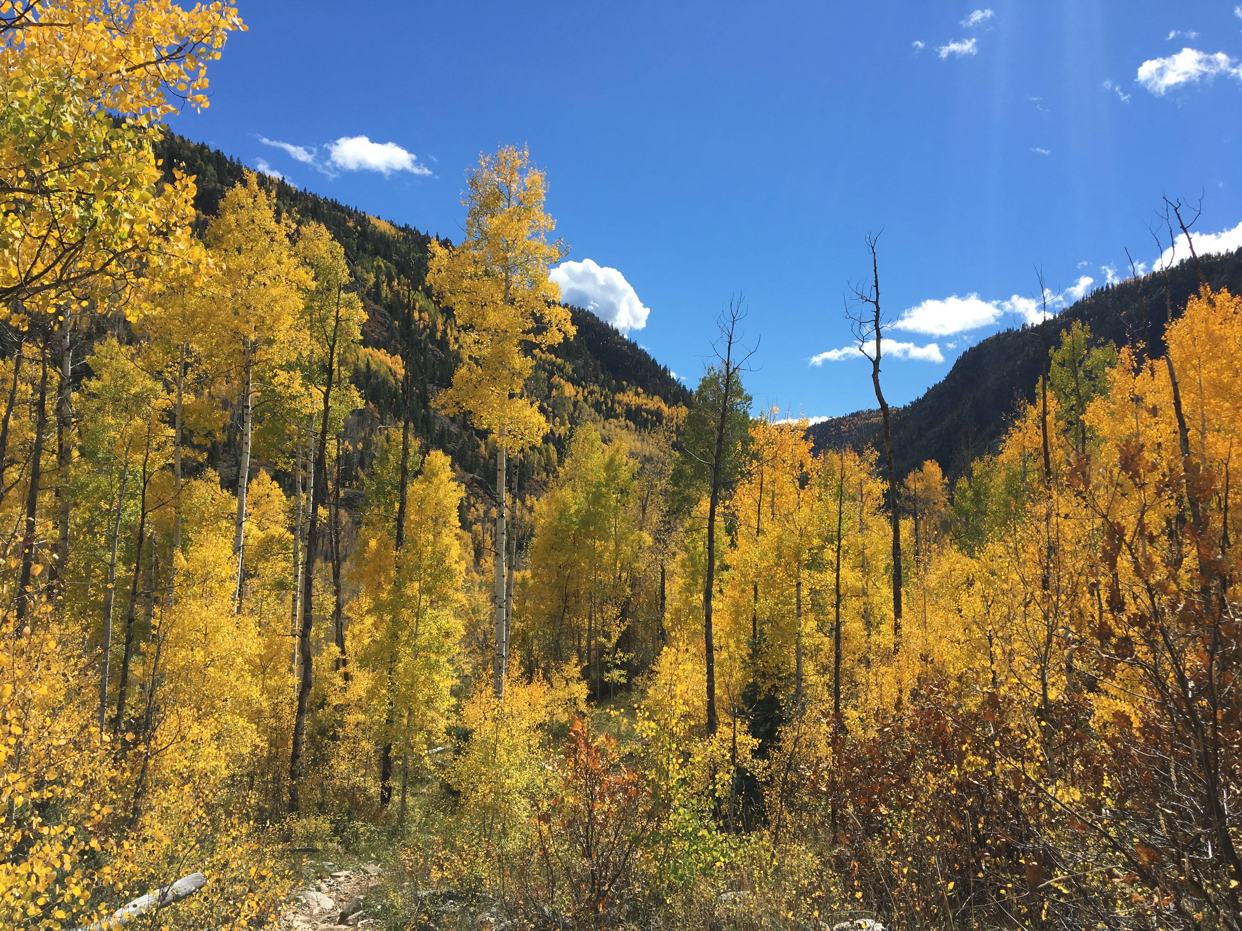 A wildfire burn from several years back has granted Haflin Creek its distinct biodiversity, where you’ll find an incredibly vivid budding aspen grove. The trail is considered difficult for both mountain biking and hiking, climbing nearly 3,000 feet in less than 8 miles, but if you stick to it, you’ll enjoy a variety of different perspectives on your favorite fall foliage. From the forest floor to the rocky slopes above the Animas Valley, this trail is nothing less than rewarding, ending with a colorful view of Baldy Mountain.